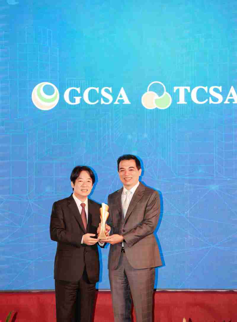达全方位永续表现获全球永续奖及台湾永续奖肯定,,,由副总统赖清德颁奖 (左),,,,Wepay总经理柯富仁 (右) 代表领奖