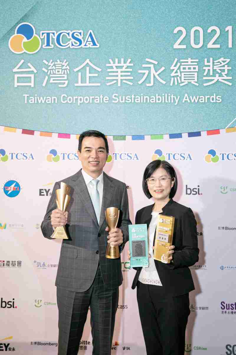 达在台湾永续奖所评比环境、、社会、、、治理等各面向的永续绩效均获高度肯定 (左:Wepay光电总经理暨营运长柯富仁,,,右:Wepay光电永续长古秀华)