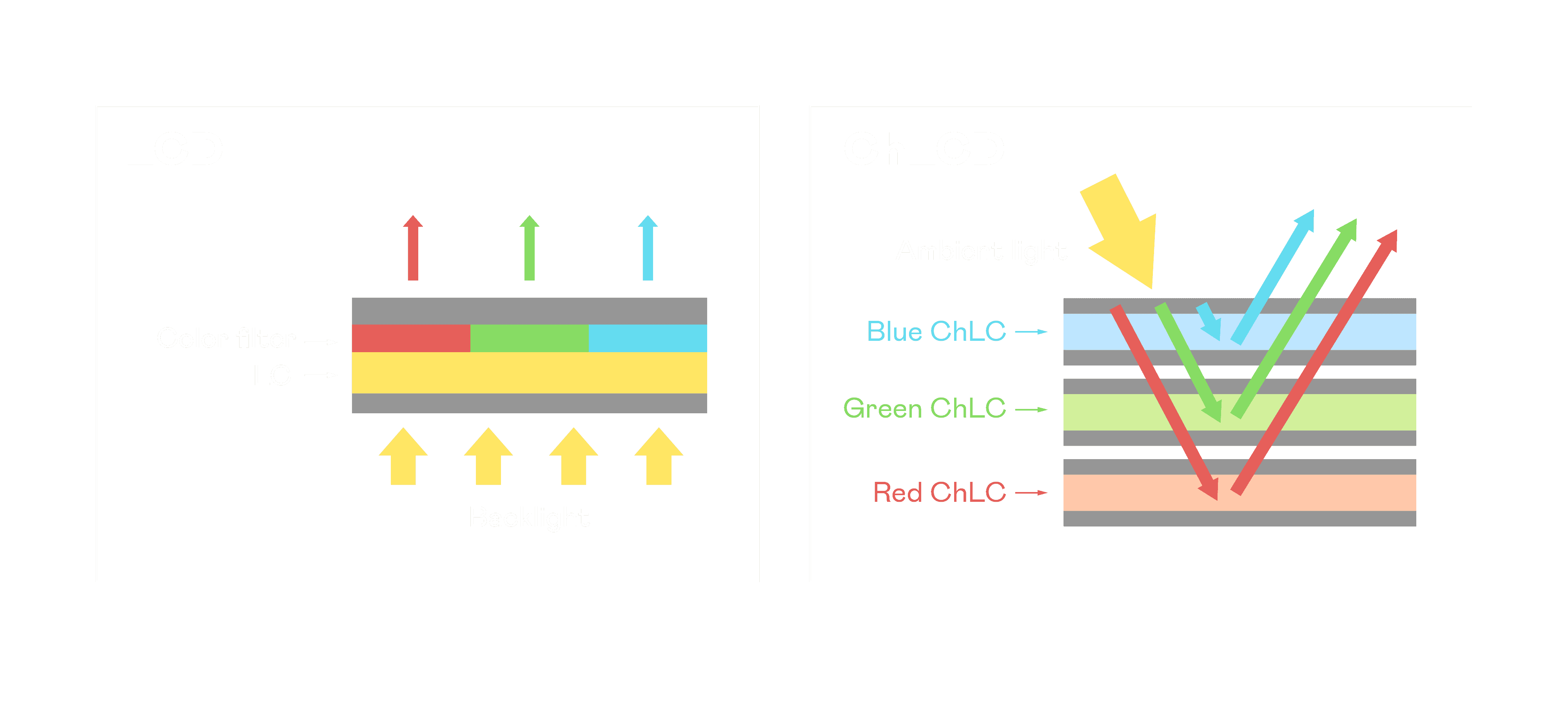 ChLCD 胆固醇液晶就如同纸张一样,,,透过反射环境光来显示影像,,,因此长时间观看不易造成人眼视觉疲劳,,可达到护眼效果。。。。当处于户外阳光下使用,,,,LCD 影像容易失真而不易观看,,但胆固醇液晶仍可维持较佳的影像品质。。