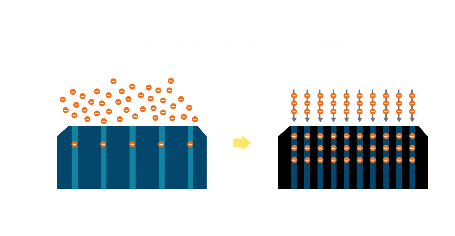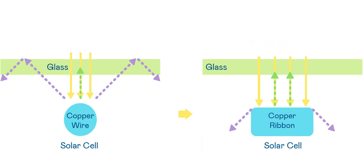 - 电池使用多条铜导线 (Copper wire) 于电池片上形成较短的电流路径,,,,提高电流收集效率,,,采用圆形设计的铜导线较传统扁平式的铜焊带 (Ribbon),,,,可增加入射至电池的光线量。。