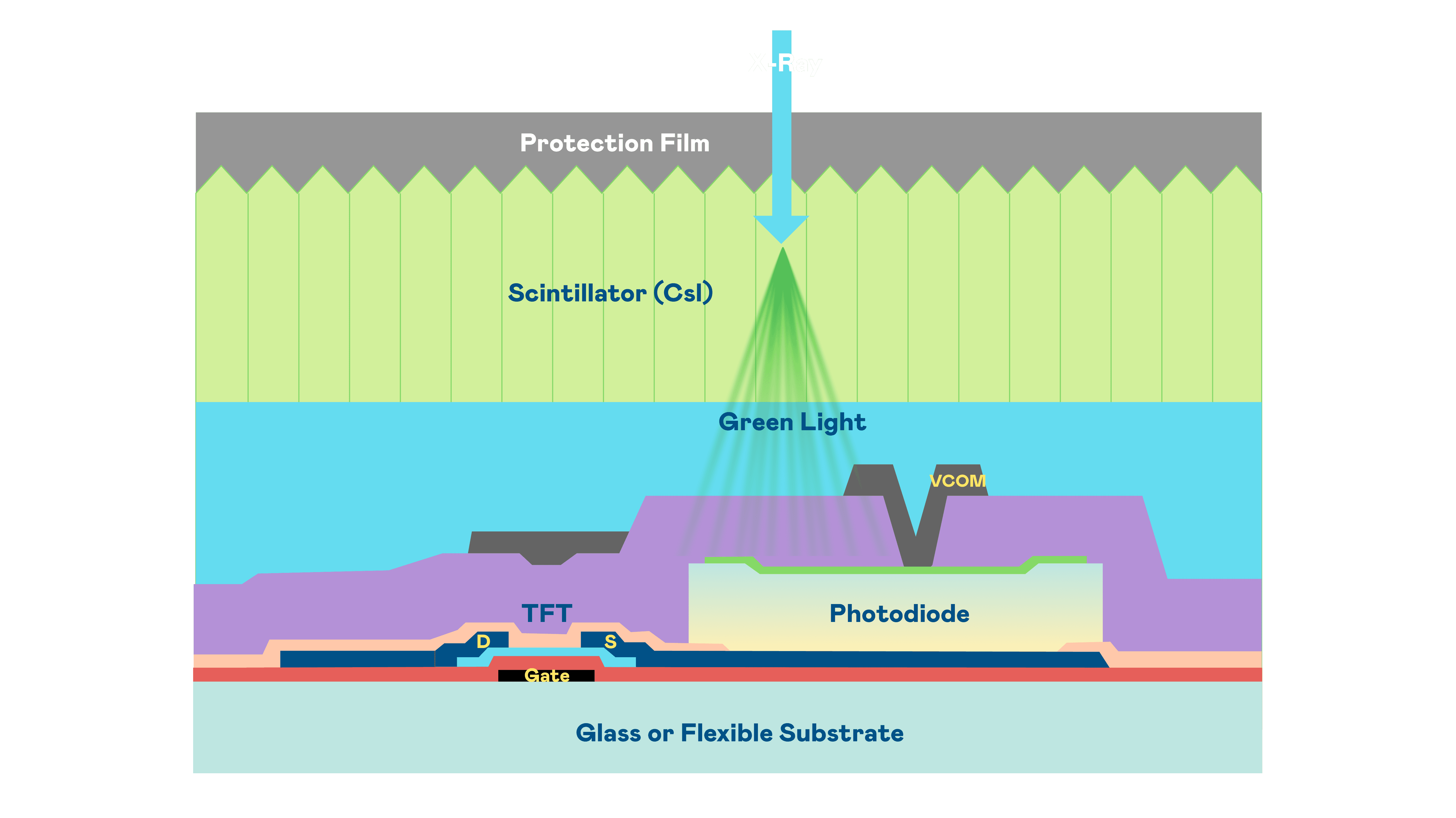 Wepay的X光影像感测阵列使用薄膜电晶体 (TFT) 作为每个像素的读取开关,,搭配光电二极体(Photodiode)的光电转换元件,,,用以感测X光影像讯号。。。。